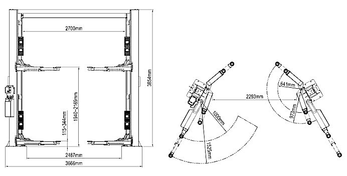 Два двухконтурных гидроцилиндра, разработанные и изготовленные японской компанией «NOK» (в соответствии со стандартом ANSI) с помощью выдвижных трансформируемых лап поднимают любой автомобиль массой не более 4,5 тонн, надежно фиксируя его в заданном положении.